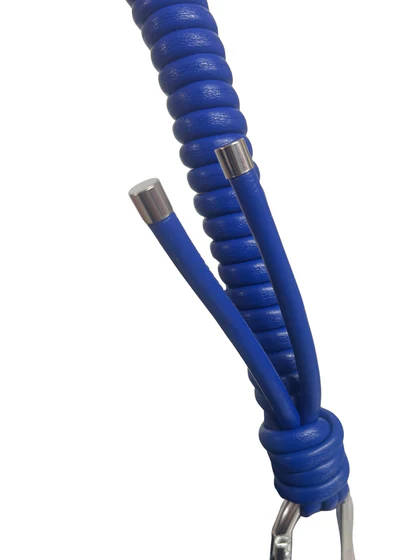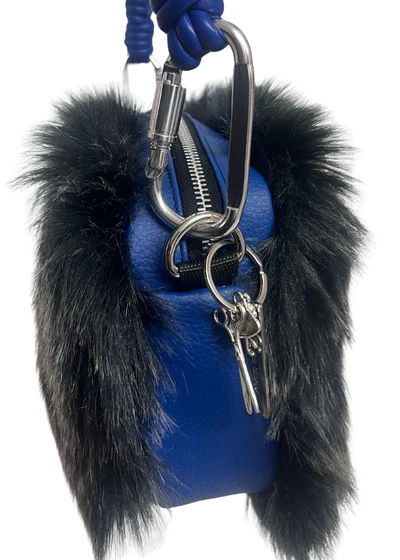 Bolso de estilo Bowling en color gris carbón. Las asas de diseño rígido presentan un trenzado helicoidal en color azul eléctrico. En la parte frontal, incorpora exclusivos charms plateados colgantes, y cierra con una cremallera personalizada de Cames Peludes para darle un punto distintivo.