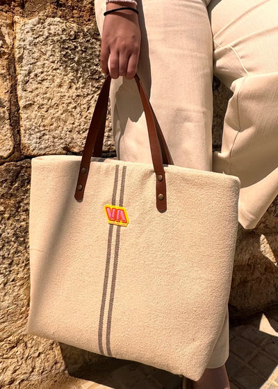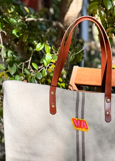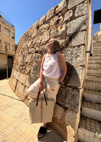Materiales: El exterior del bolso está diseñado con un tejido rústico beig con líneas marrón que aporta una textura única y confortable al diseño.
