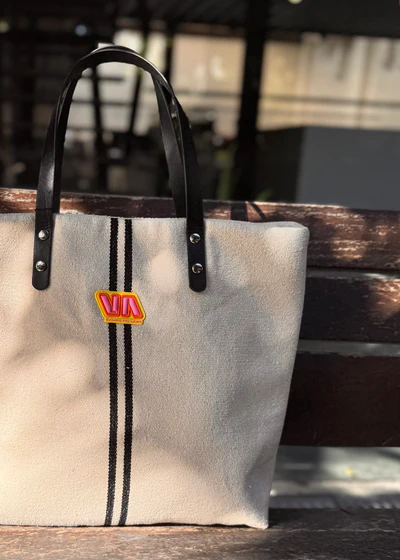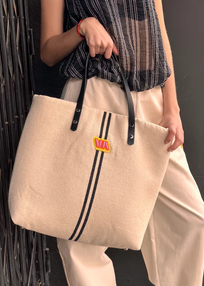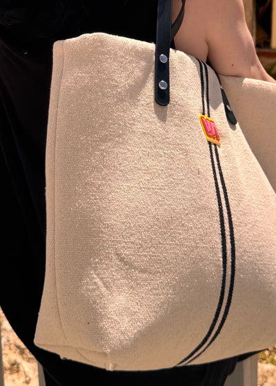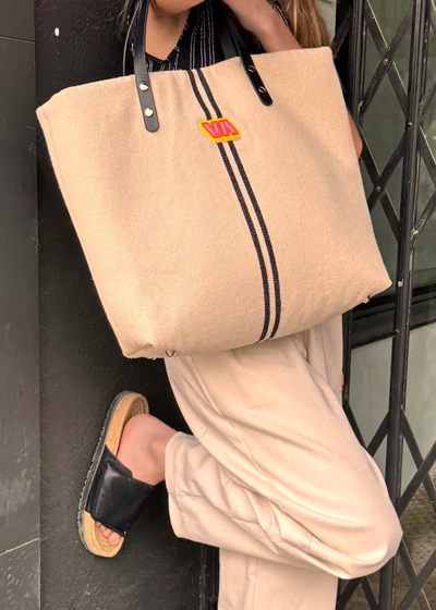 Materiales: El exterior del bolso está diseñado con un tejido rústico beig con líneas negras que aporta una textura única y confortable al diseño.