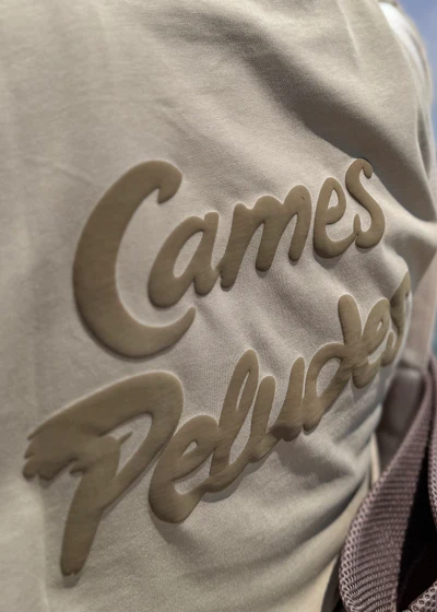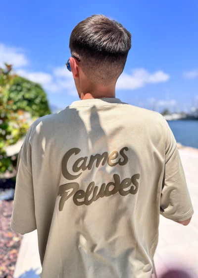 Un estampado delante de nuestro eslogan en inglés en color marrón y detrás un estampado puff de Cames Peludes que da una textura única y innovadora.