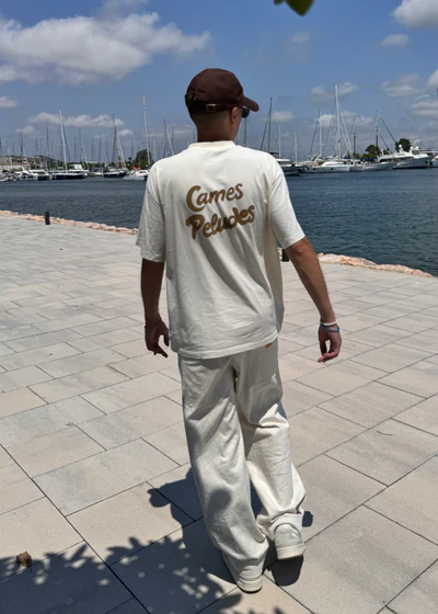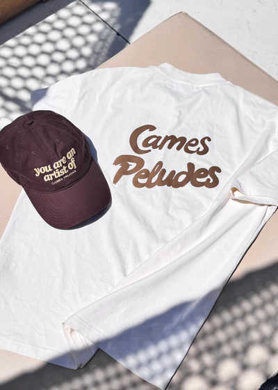 Un estampado delante de nuestro eslogan en inglés en color marrón y detrás un estampado puff de Cames Peludes que da una textura única y innovadora.