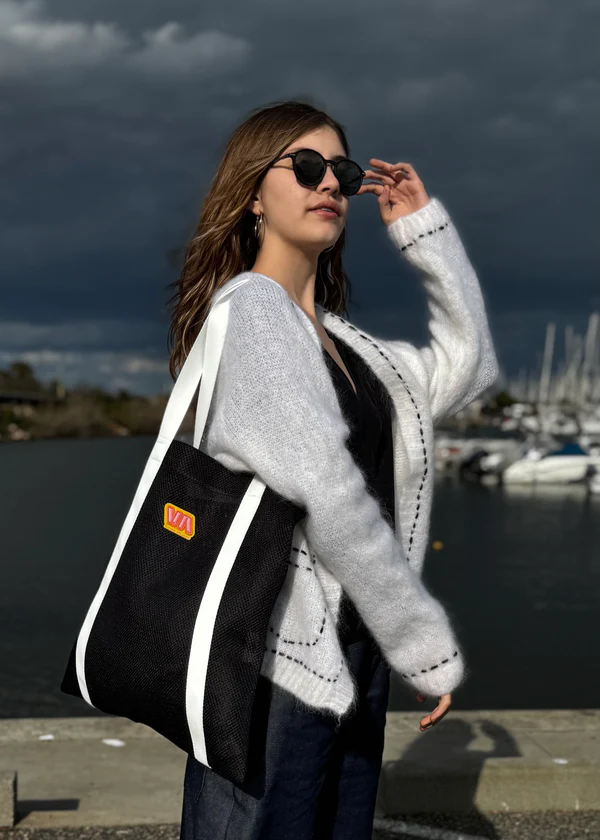 Cárdigan blanco de mohair, con un tacto suave y cálido. Destaca por su adorno de pespuntes negro artesanales, que aportan un acabado único y detallado.