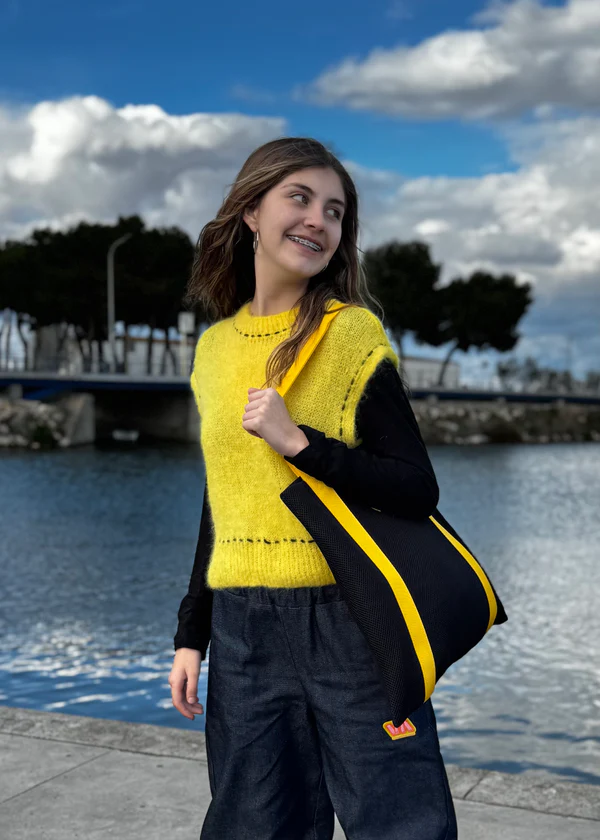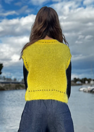 Chaleco amarillo de mohair sin mangas, con un tacto suave y cálido. Destaca por su adorno de pespuntes negro artesanales, que aportan un acabado único y detallado.
