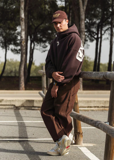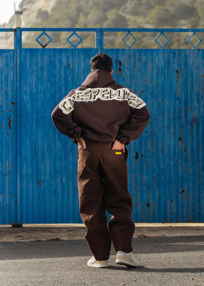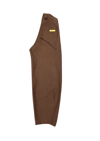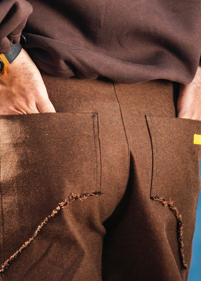 Pantalón vaquero de color marrón con un diseño lleno de detalles artesanales. Los bolsillos delanteros presentan una forma curva con un acabado desfilagarchado que les da un aspecto único y muy característico.