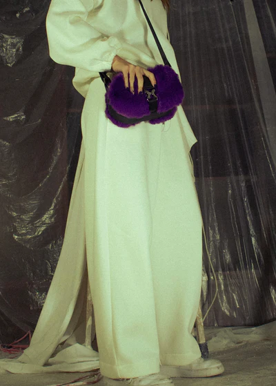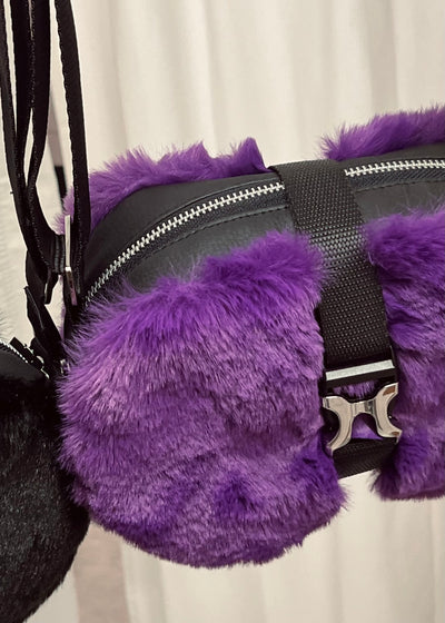 Materiales: Las dos caras del bolso están hechas con un patrón de tejido de piel morada sintética de alta calidad, mientras que el contorno está finamente acabado con polipiel negra. En su interior, está revestido con un suave forro negro de algodón.