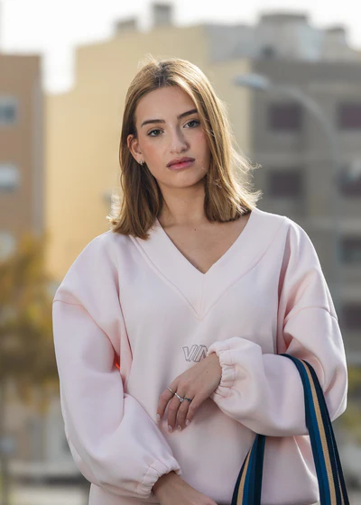Sudadera oversize de cuello pico de color salmón, con un diseño minimalista. Lleva un pequeño estampado delantero con el logotipo de Piernas Peludas, trazado como si estuviera dibujado a lápiz. En la espalda, un segundo estampado situado lateralmente entre el centro y el lado.