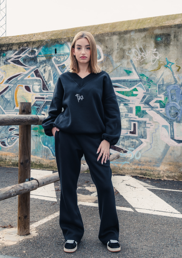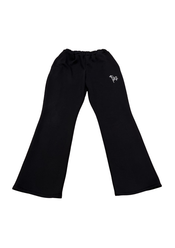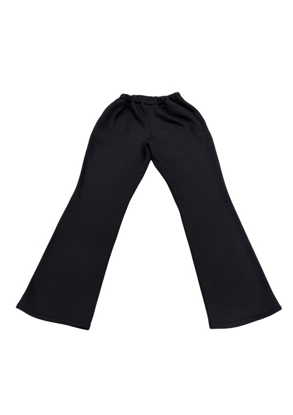 Pantalón de felpa de forma flare de color negro, pensados para combinar con la sudadera de cuello pico. Con cintura elástica para mayor comodidad, bolsillos laterales y un acabado ligeramente evasé en la parte inferior que alarga visualmente la pierna.