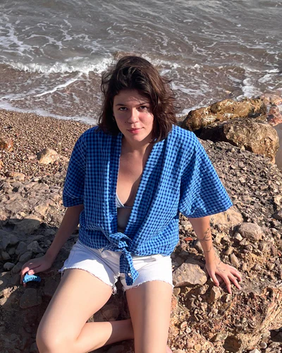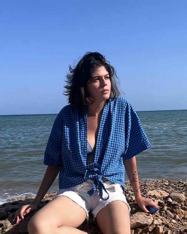 Kimono, talla S, con parte delantera abierta con cuadros vichy azul eléctrico oscuro y azul azafata con 2 tiras largas sin botones, producto fabricado y diseñado en La Ràpita a mano.