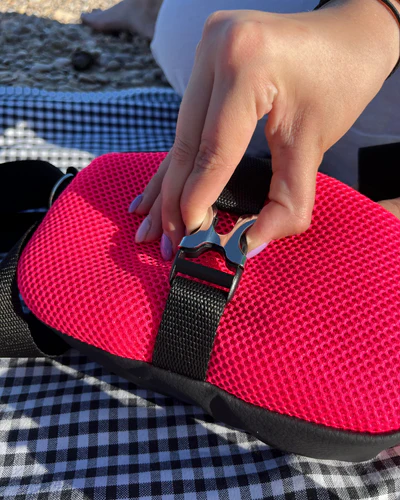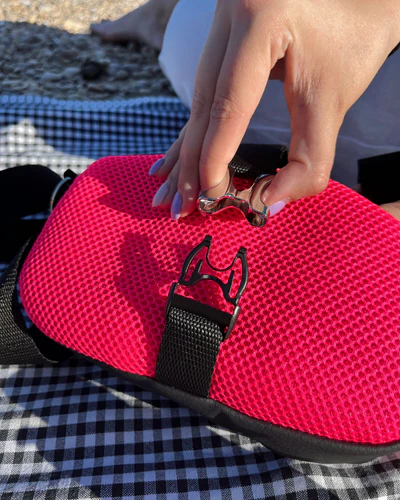 Cierre: La pieza central del bolso es su cremallera plateada personalizada con el logo de Cames Peludes. Además, presenta unas elegantes anillas plateadas en los laterales y una hebilla personalizada, mitad negra de plástico y mitad plateada de metal.