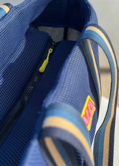 Bolso de color azul tinta. Las tiras de 65 cm mezclan cuatro tonos naturales -azul y beig- que aportan contraste y un toque frío al conjunto.